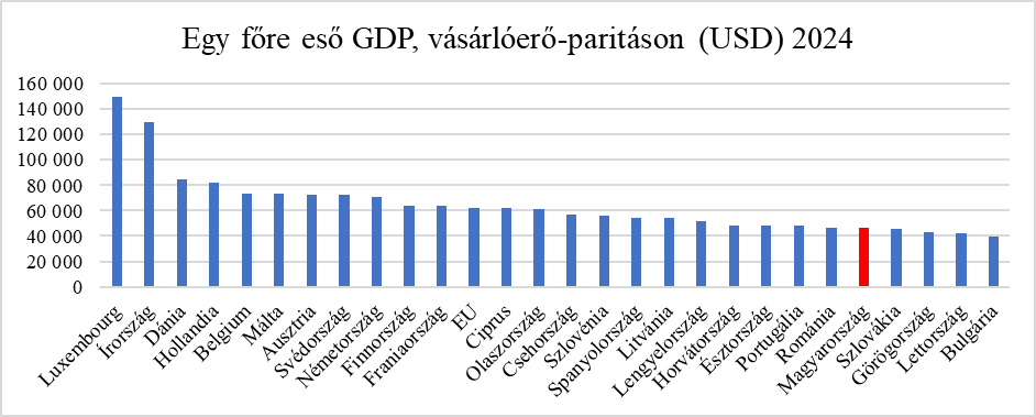 Emellett, ha már nemzetközi összehasonlítást szeretnénk, célszerűbb ehhez a vásárlóerő-paritáson számított GDP-t alapul venni. A KSH adatai szerint egy főre eső vásárlóerő-paritáson mért GDP alapján 2024-ben az Európai Unió tagállamai között a 23. helyen álltunk, megelőzve ezzel Bulgáriát, Lettországot, Görögországot, sőt Szlovákiát is. Tehát ismét: Magyarország nem az unió legszegényebb állama.