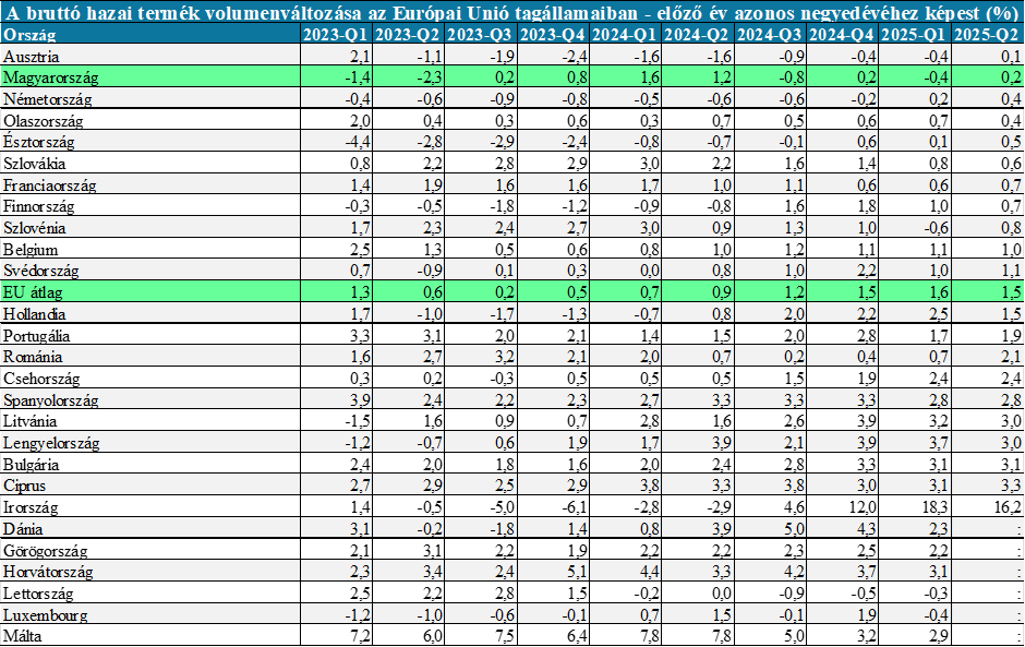 2025 II. negyedévében az Európai Unió gazdasági teljesítménye – a szezonálisan és naptárhatással kiigazított adatok szerint – 1,5%-kal nőtt az előző év azonos időszakához képest. Az Eurostat által közzétett 21 tagállam adatai alapján mindegyikben nőtt a GDP volumene. A legnagyobb (16,2%-os) növekedés Írországban történt, őt pedig Ciprus követte a rangsorban, 3,3%-os bővüléssel. A magyar gazdaság teljesítménye a szezonálisan és naptárhatással kiigazított adat szerint 0,2%-kal növekedett.